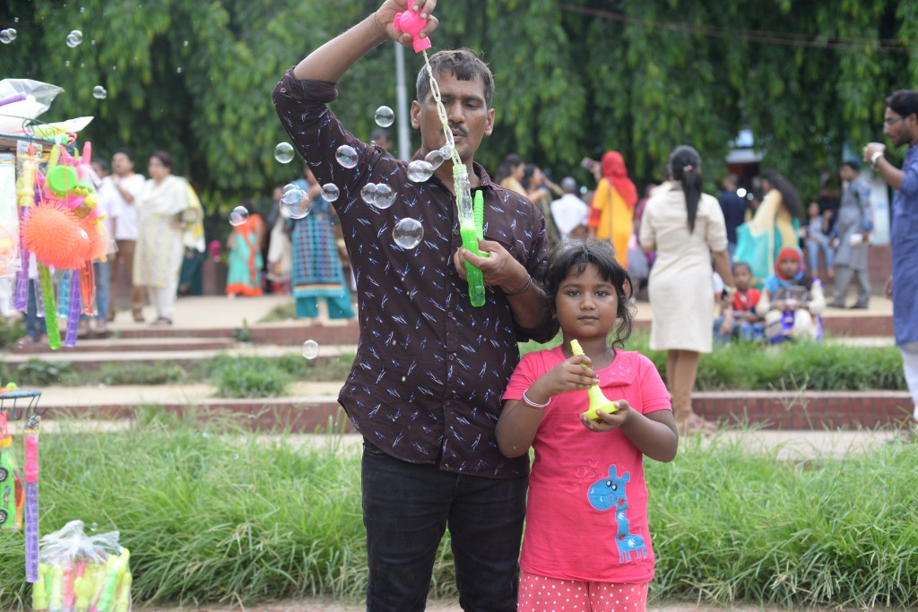 লেকের মাঝের ওভাল- যেখানে সাধারনত অনুষ্ঠান হয় – সেখানে গিয়ে দেখলাম মানুষ গিজ গিজ করছে। দারুন! সবাই ঈদের নতুন পোশাক পরা – রঙ ঊপচে পড়ছে যেন! একটা জিনিস খুবই মজার – বয়স নির্বিশেষে সবাই সেলফী তোলায় ব্যস্ত। পাশাপাশি বসা থাকা মানুষগুলো একে অন্যের সাথে কথা বলছে কম … সম্ভবত টেক্সট করে ভাব বিনিময় করছে! সেটা স্বাস্থ্যের জন্য মনে হয় ভালো। কথা বললেই মুখ খুলতে হয় – মুখ খুললেই ধুলো প্রবেশের সম্ভাবনা!