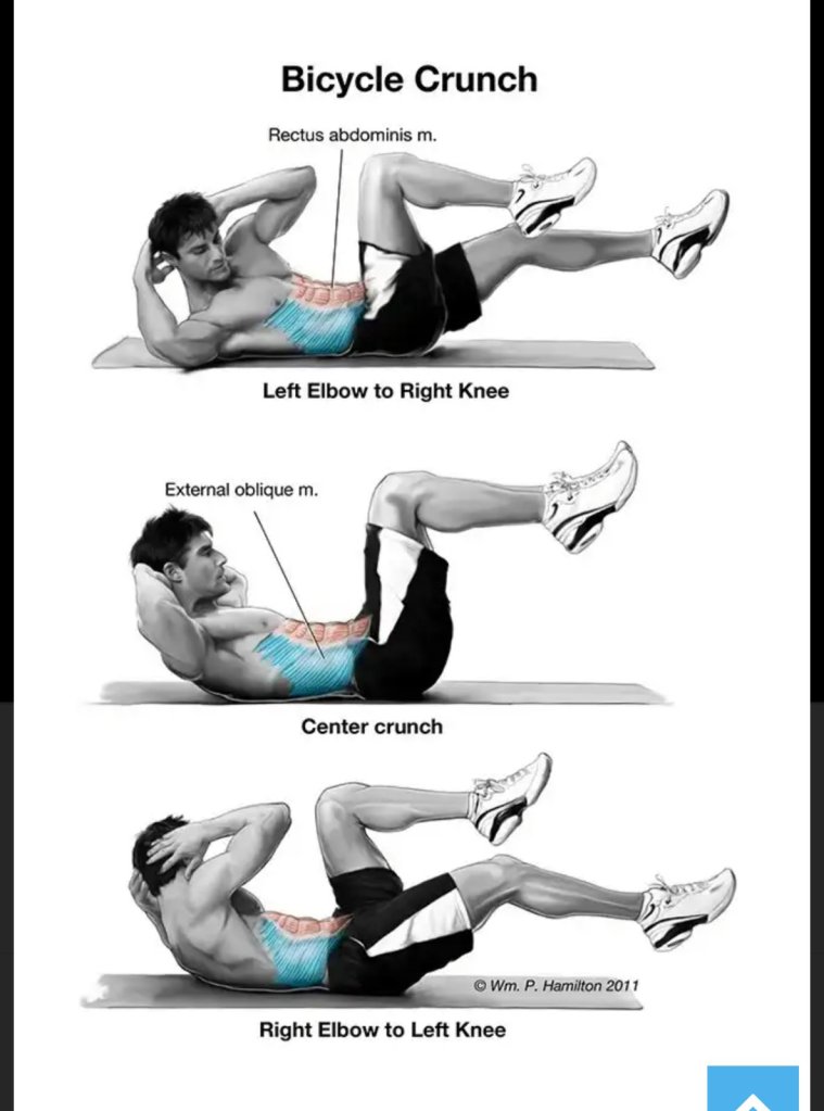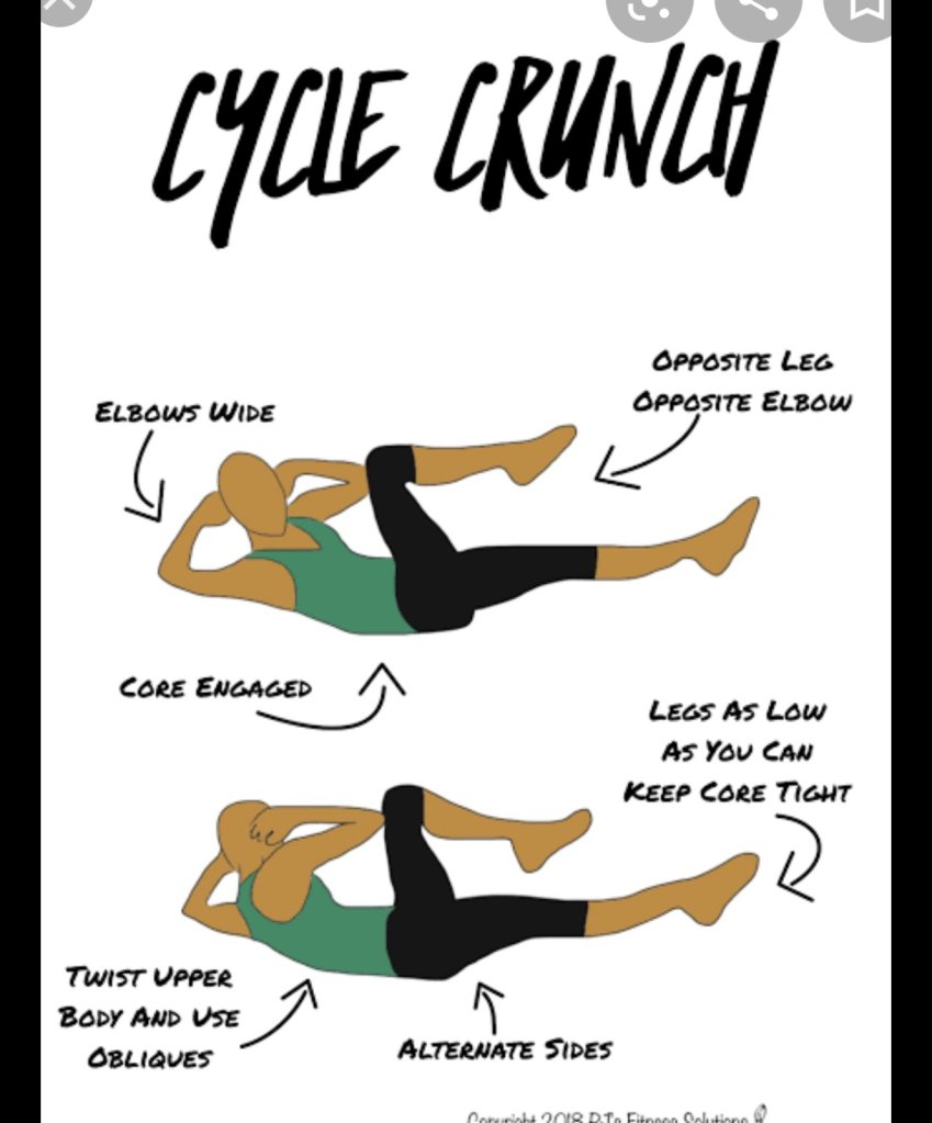 একটি ম্যাটের উপর সোজা হয়ে শুয়ে হাতদুটো মাথার পিছনে নিন। এবার ধিরে ধিরে ঘাড় ও মাথা তুলে সামনের দিকে ঝোঁকান আর পা দুটো দিয়ে সাইকেল চালাতে থাকেন। এতে একইসাথে ক্রাঞ্চ ও সাইক্লিং দুটোই চলবে।