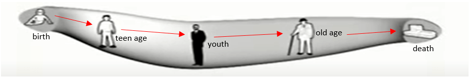 মানুষের যদি চেতনা থাকে, সেই চেতনা আসলে এই চতুর্মাত্রিক পথ ধরে অতীত থেকে ভবিষ্যতের দিকে এগিয়ে যায় এইভাবে।